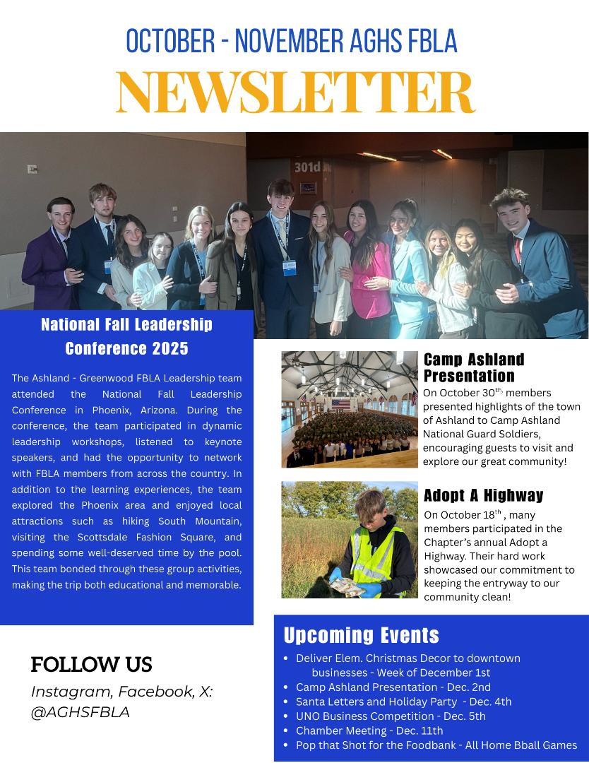 In October, members of Ashland - Greenwood FBLA engaged in community service by participating in two impactful events. Members took part in an annual highway cleanup on October 18th, helping keep highway 6 clean and welcoming for residents and tourists. In addition to this, on October 25, the chapter hosted a hayrack ride where members collected nonperishable items for the local food bank.These activities not only help support those in need but allow the members to become community-minded business leaders.